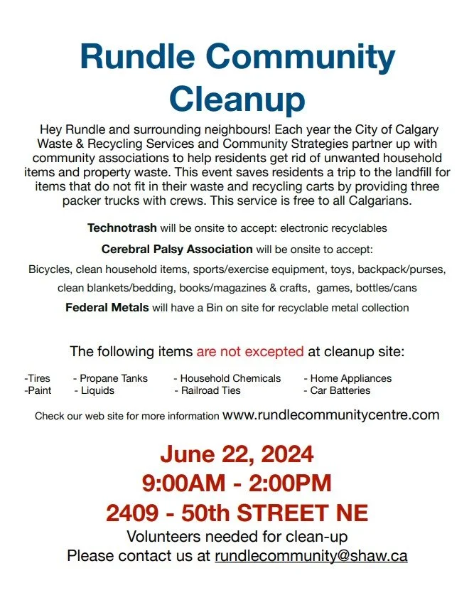 The Rundle Community will be having a Community Clean-up on June 26th from 9am - 1pm. We need volunteers to direct traffic, help unload vehicles with household items and compostable materials. We will also have electronic recycling on site. To volunteer please email us at rundlecommunity@shaw.ca